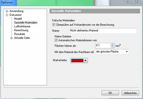 Bei allen sichtbaren Gebieten wird überprüft, ob sie ein Material verwenden, welches nicht vorhanden sein sollte. Falls diese Option ausgewählt ist, wird das physikalische Modell nach Gebieten mit den kritischen Materialien abgesucht. Kleine Gebiete mit kritischen Materialien werden - falls die entsprechende Option ausgewählt ist - automatisch nach bestimmten Regeln materialisiert, grössere Gebiete werden markiert. |