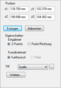 Geben Sie die x- und y- Koordinaten des Startpunktes in den entsprechenden Feldern ein, danach die Koordinaten des Endpunktes (oder die Richtung und die Länge der Linie). Die Eingaben können entweder in kartesischen oder in polaren Koordinaten erfolgen. Um den Vorgang abzuschliessen, klicken Sie auf den Erzeugen-Knopf.