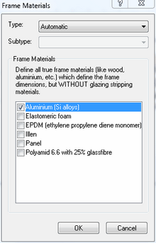 Here, you have to determine all the frame materials of the frame section which define the frame dimensions. The settings will be needed for the automatic calculation of frame U-values (Uf-value) according to EN ISO 10077-2 respectively for the automatic calculation of joint U-values (UTJ-value) according to EN ISO 12631 .